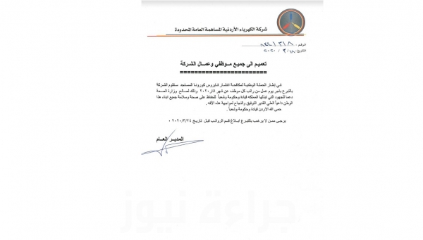 شركة الكهرباء الأردنية تتبرع بأجر يوم عمل من راتب كل موظف لوزارة الصحة .. وثيقة