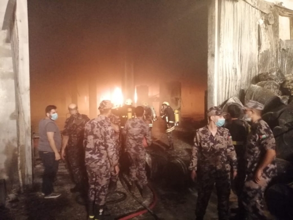 الدفاع المدني يواصل إطفاء حريق مصنع الإسفنج في اربد