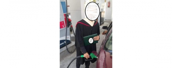 اربد : شاب يرتدي ثوب تخرجه من جامعة اليرموك بمكان عمله في محطة محروقات