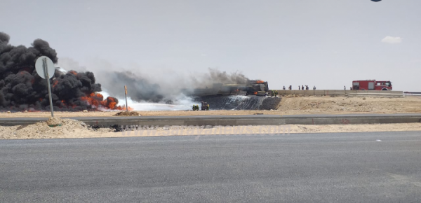 النيران تحاصر سائق صهريج اندلعت فيه النيران والدفاع المدني يحاول اخراجه في معان